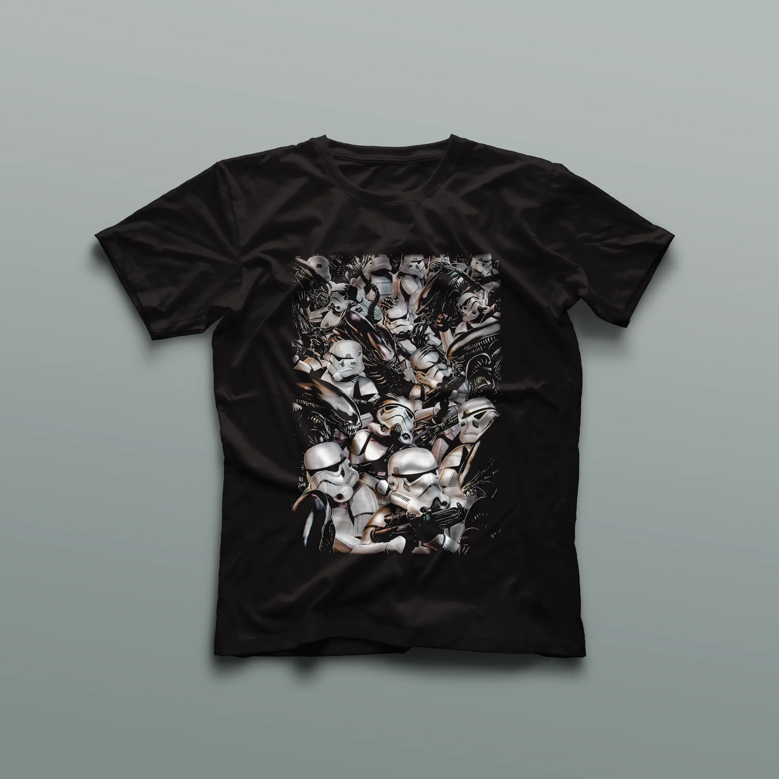 Imagina a los temidos Stormtroopers, soldados de élite del Imperio Galáctico, enfrentándose a las criaturas más aterradoras del cine de ciencia ficción: los Aliens. Esta camiseta captura ese enfrentamiento en un diseño espectacular y dinámico. Con detalles precisos, desde las armaduras de los Stormtroopers hasta las criaturas alienígenas con sus icónicas mandíbulas, el diseño transporta a los fans a un combate fuera de este mundo. Los colores vibrantes, las sombras intensas y la acción capturada en el momento justo hacen de esta camiseta una pieza imprescindible para cualquier fan de la ciencia ficción.