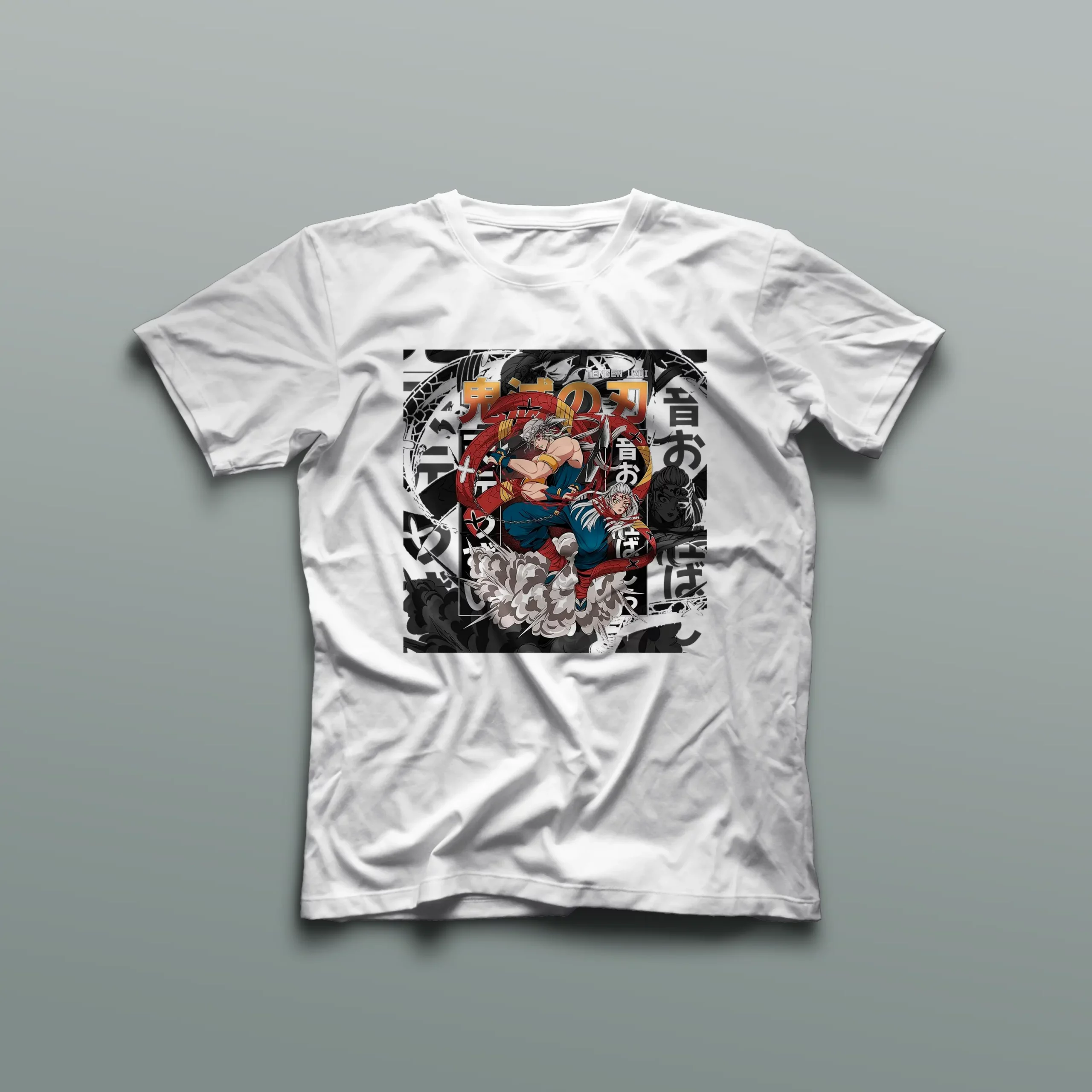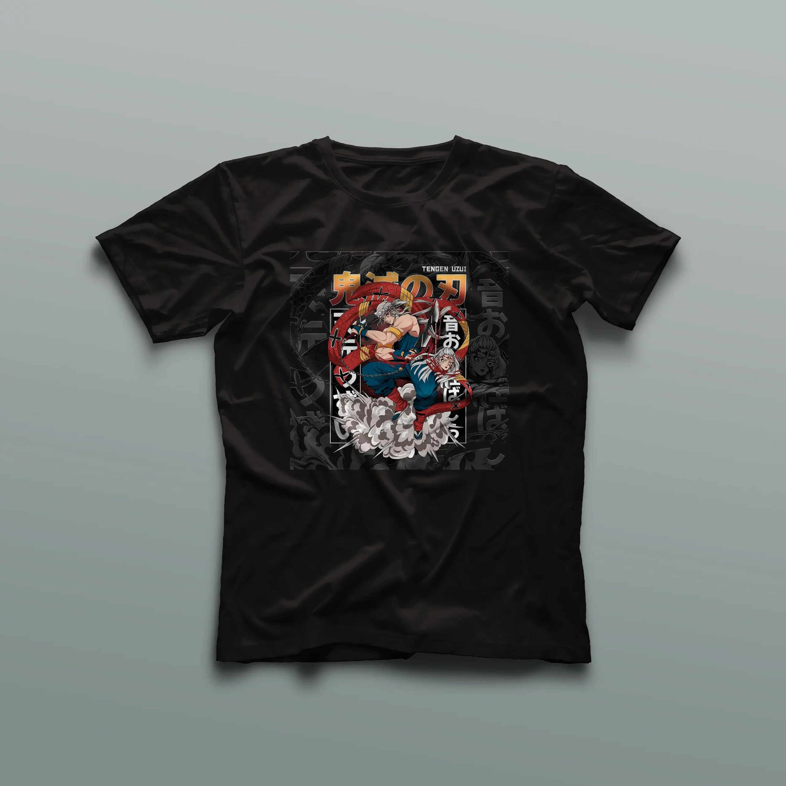 La camiseta capta la esencia del Pilar Sonriente con detalles vibrantes y expresiones que reflejan su personalidad única. Confeccionada con materiales de alta calidad, esta prenda no solo es una declaración de moda, sino también un tributo al valiente guerrero que es Tengen Uzui.