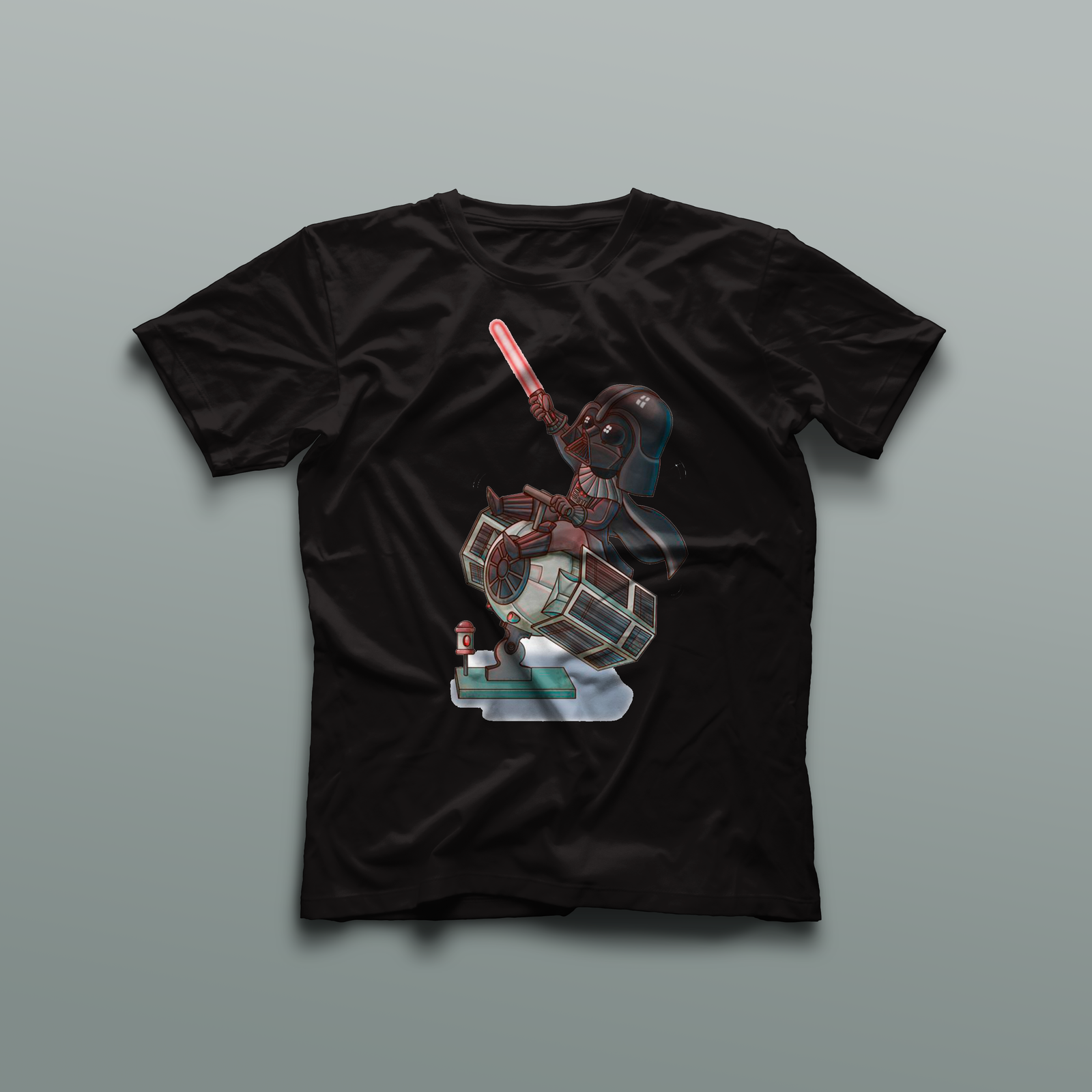 Imagina a Darth Vader, imponente y serio, pero en una situación divertida, montado en una versión en miniatura de su emblemático caza TIE Fighter, que ahora se convierte en una máquina de caballito infantil. Este diseño captura la esencia del villano más querido de Star Wars, mientras añade un toque de ironía y humor que cualquier fan apreciará. Con detalles precisos y un estilo de arte vibrante, esta camiseta será el centro de atención en cualquier lugar al que vayas.