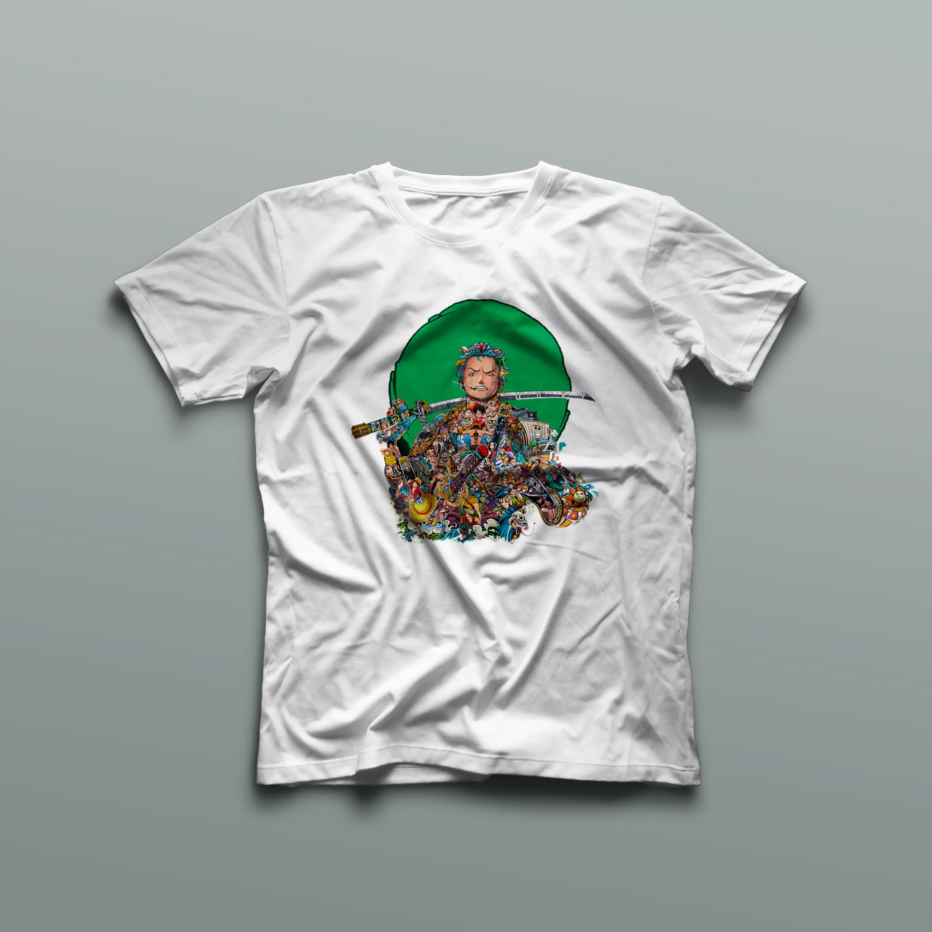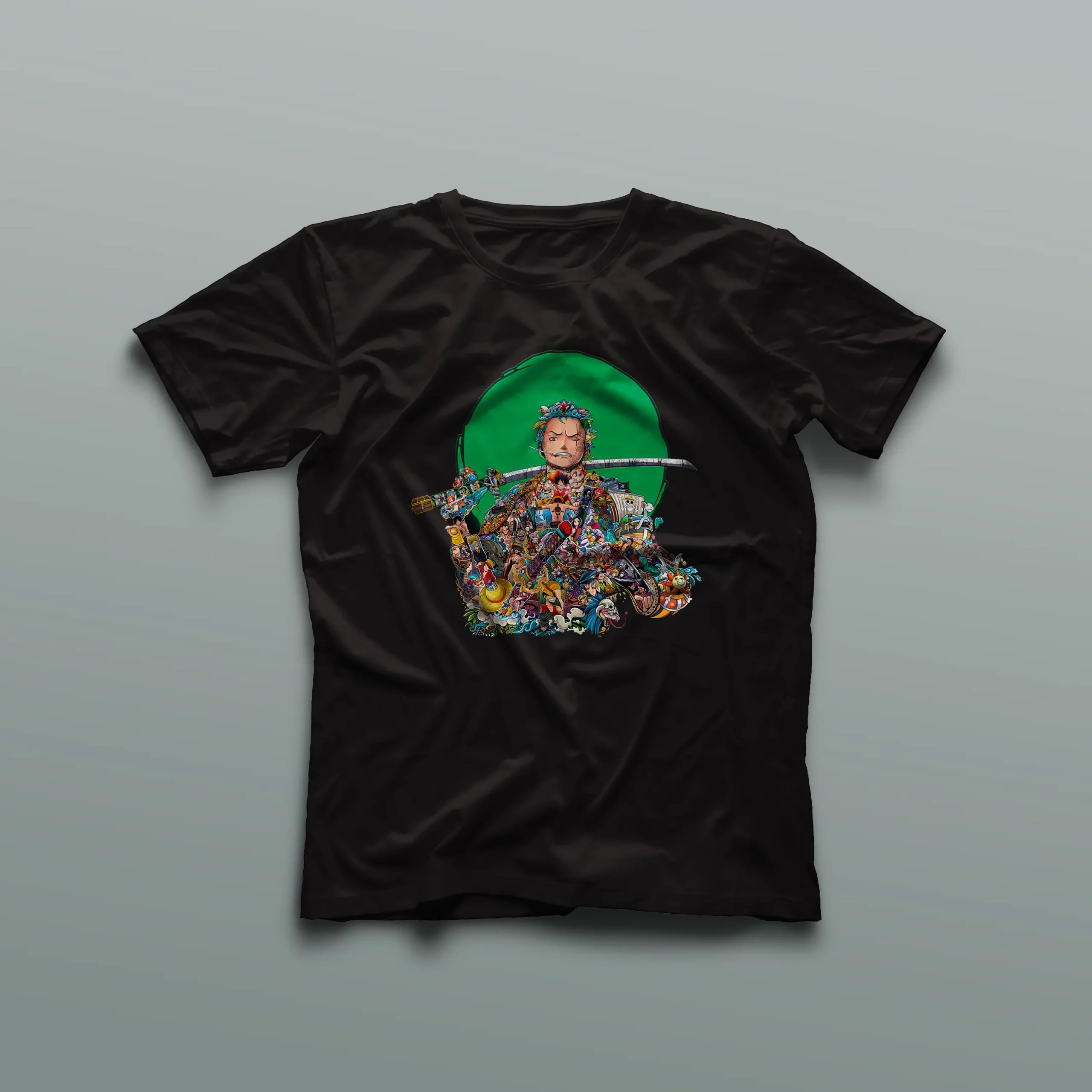 Cada imagen detallada de Zoro en la camiseta cuenta una parte de su historia, mostrando su evolución y valentía a lo largo de One Piece. La prenda no solo es una expresión de moda, sino también un tributo a uno de los personajes más emblemáticos del anime.